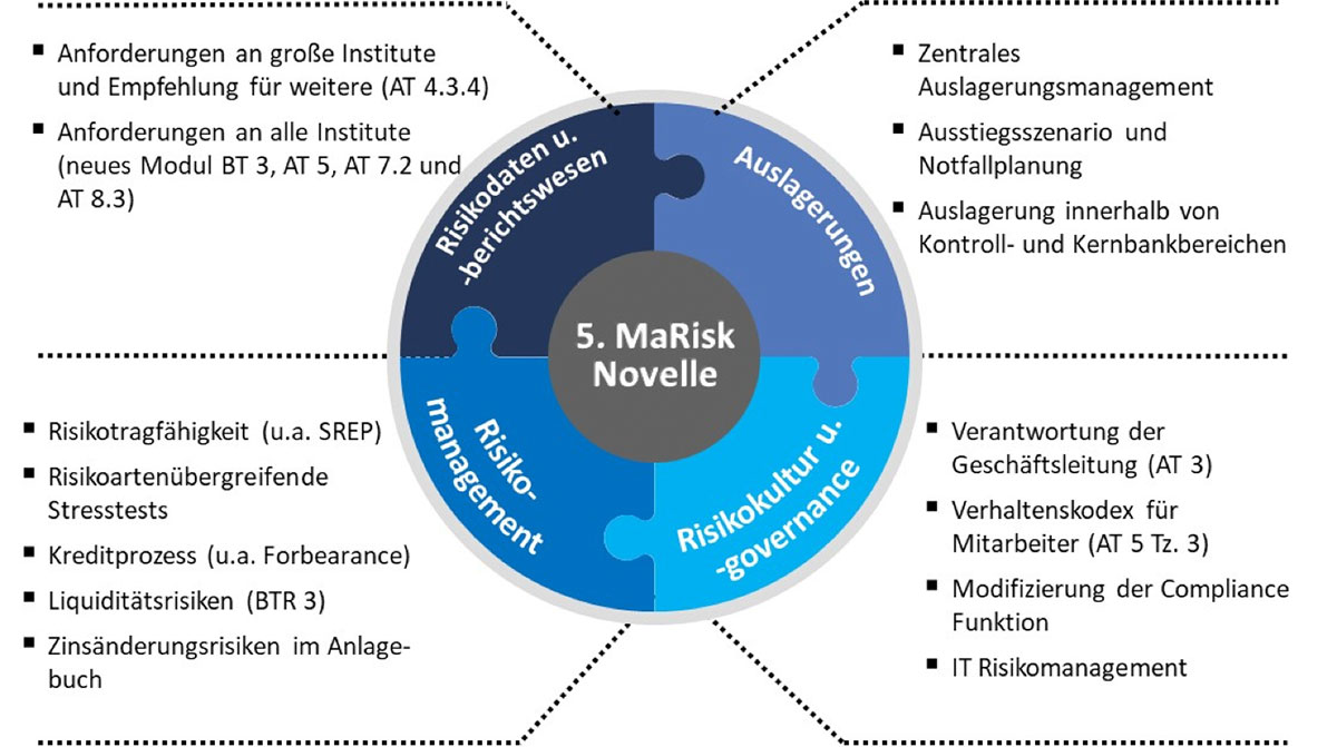 Die Bereiche der 5. MaRisk Novelle mit wesentlichen Änderungen und neuen Anforderungen an die Kreditinstitute lassen sich wie folgt gliedern.