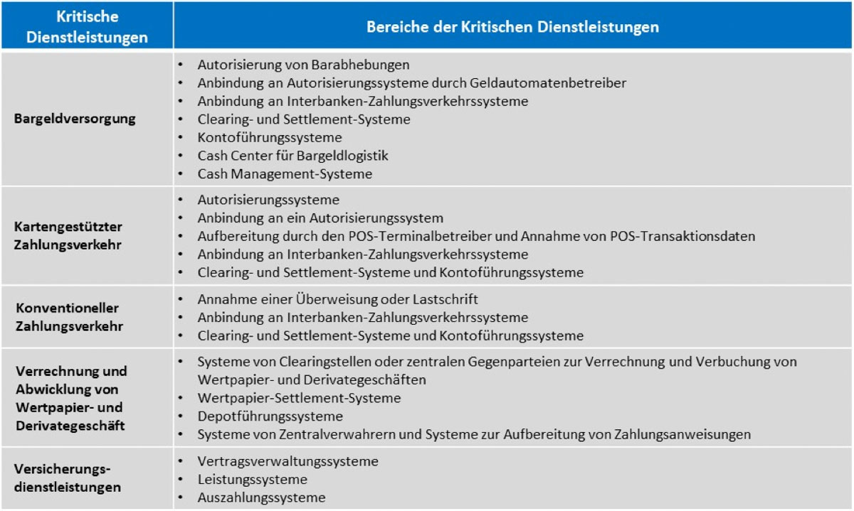 Die nachstehende Tabelle gibt einen Überblick über die Kritischen Dienstleistungen nach der KritisV.