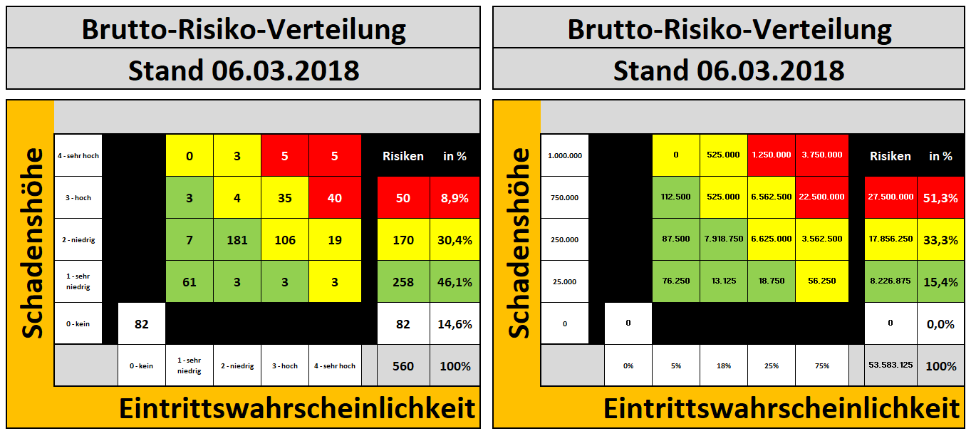 Für die Erstellung der Risiko-Kontroll-Matrix (3.a) werden die Ergebnisse der Workshops zur Risikoanalyse (2.) genutzt. Für die Risikohöhe und Eintrittswahrscheinlichkeit können gröbere oder feinere Raster gewählt werden. Nachfolgendes Beispiel hat fünf Schadenshöhen (0 = keine, 1 = sehr niedrig, 2 = niedrig bis mittel, 3 = hoch, 4 = sehr hoch) deren Beträge frei wählbar sind.  Für die Eintrittswahrscheinlichkeit wurden ebenfalls 5 Raster gewählt (0 = keine, 1 = sehr niedrig, 2 = niedrig bis mittel, 3 = hoch, 4 = sehr hoch) deren Prozentsätze ebenfalls frei wählbar sind.