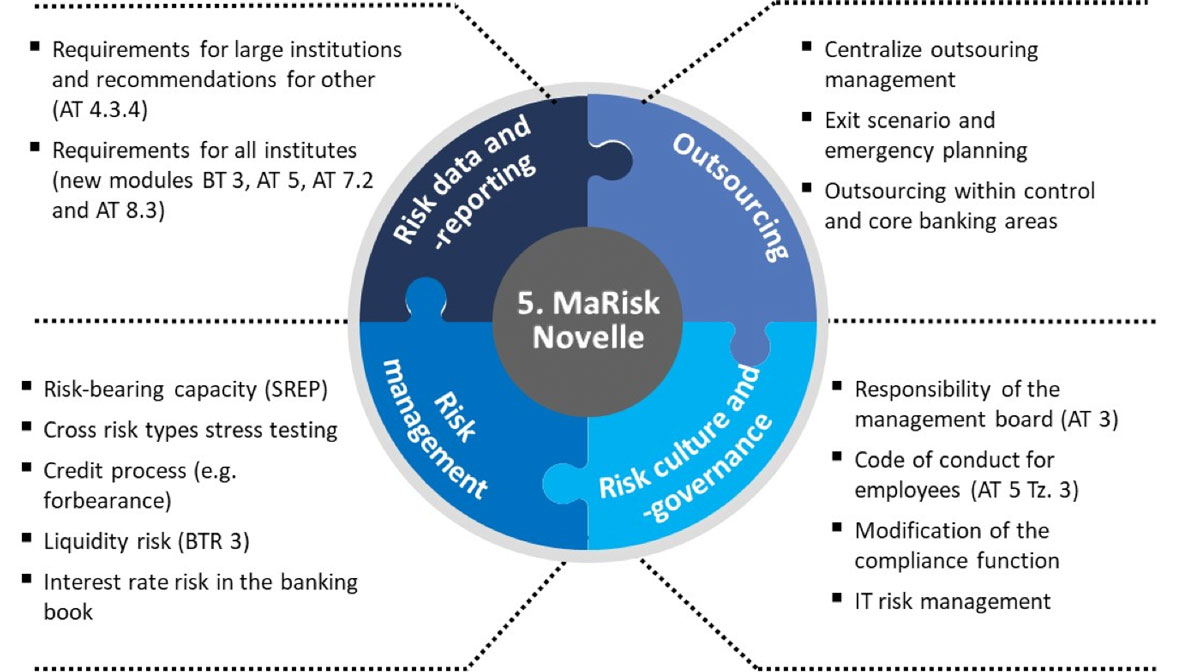 The areas of the 5th MaRisk amendment with significant changes and new requirements for the banks can be broken down as follows.