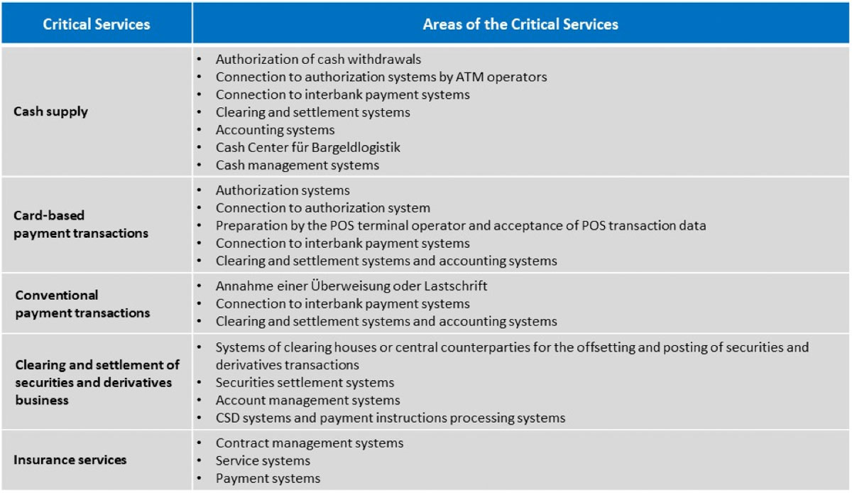 In addition, institutions must comply with the requirements of the BSI-KritisV amended as of 30 July 2017, provided that they are operators of services that are considered Critical Infrastructures due to the exceeding of mostly transaction-oriented thresholds.