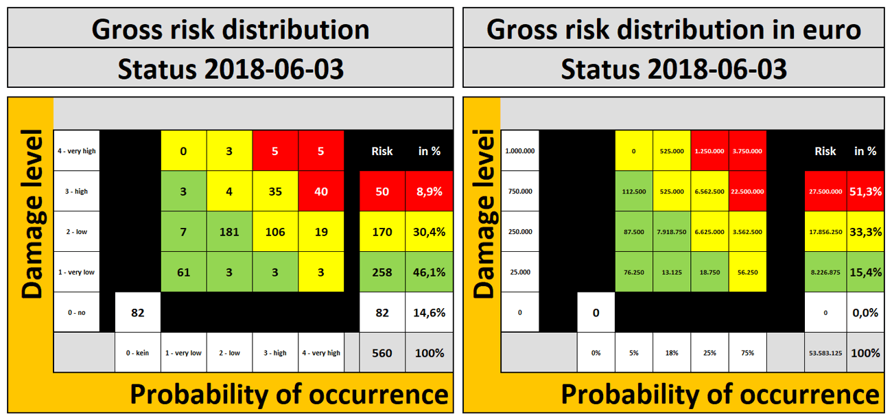 The results of the risk analysis workshops (2.) are used to create the risk control matrix (3.a). Coarser or finer grids can be selected for the risk level and probability of occurrence. The following example has five damage levels (0 = none, 1 = very low, 2 = low to medium, 3 = high, 4 = very high) whose amounts can be freely selected. For the probability of occurrence, 5 grids were also selected (0 = none, 1 = very low, 2 = low to medium, 3 = high, 4 = very high) whose percentages are also freely selectable.